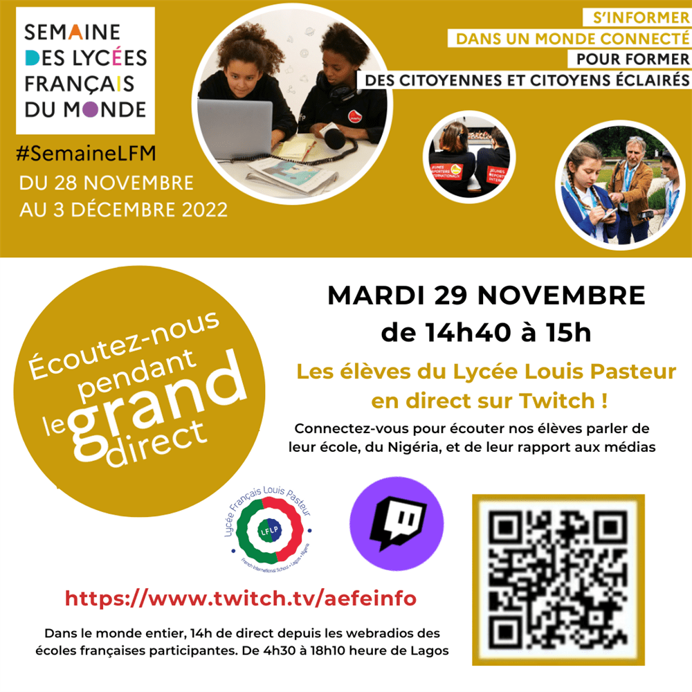 First the launch of our web radio Eko Radio during the Grand Direct AEFE. Through interviews, chronicles and round table discussions, the CM2 and 3e students showcased Nigeria and our school. The live broadcast also allowed them to discuss with a journalist from AFP, Mr Alexandre Martins Lopes, about media and how to get information as a young citizen.